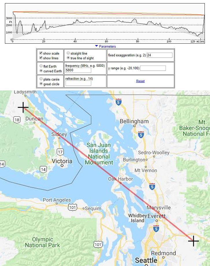 Mark, is that for Haystack? Can you do another for Lookout? Steve From: PSDR [mailto:psdr-bounces@hamwan.org] On Behalf Of Mark Weisenfeld Sent: 25 July 2018 12:19 To: psdr@hamwan.org Subject: Re: [HamWAN PSDR] PSDR Digest, Vol 65, Issue 12 Would be interesting. Lots of open water over that curvature. On Wed, Jul 25, 2018 at 12:00 PM <psdr-request@hamwan.org <mailto:psdr-request@hamwan.org> > wrote: Send PSDR mailing list submissions to psdr@hamwan.org <mailto:psdr@hamwan.org> To subscribe or unsubscribe via the World Wide Web, visit http://mail.hamwan.net/mailman/listinfo/psdr or, via email, send a message with subject or body 'help' to psdr-request@hamwan.org <mailto:psdr-request@hamwan.org> You can reach the person managing the list at psdr-owner@hamwan.org <mailto:psdr-owner@hamwan.org> When replying, please edit your Subject line so it is more specific than "Re: Contents of PSDR digest..." Today's Topics: 1. Re: [BCWARN] Mt Brenton (Steven Bradshaw) ---------- Forwarded message ---------- From: Steven Bradshaw <ve7cbh@gmail.com <mailto:ve7cbh@gmail.com> > To: "'Puget Sound Data Ring'" <psdr@hamwan.org <mailto:psdr@hamwan.org> >, "'BC Wireless Amateur Radio Network Discussion List'" <bcwarn@bcwarn.net <mailto:bcwarn@bcwarn.net> > Cc: Bcc: Date: Tue, 24 Jul 2018 20:18:02 -0700 Subject: Re: [HamWAN PSDR] [BCWARN] Mt Brenton Roger that! Steve VE7CBH From: PSDR [mailto:psdr-bounces@hamwan.org <mailto:psdr-bounces@hamwan.org> ] On Behalf Of Ian Procyk Sent: 23 July 2018 19:08 To: BC Wireless Amateur Radio Network Discussion List <bcwarn@bcwarn.net <mailto:bcwarn@bcwarn.net> > Cc: psdr@hamwan.org <mailto:psdr@hamwan.org> Subject: Re: [HamWAN PSDR] [BCWARN] Mt Brenton That was probably me presenting back then. In any case, if there is interest in trying to light up this rather long path feel free. We have more than enough problems keeping the 50km links over the straight up... On Mon, Jul 23, 2018 at 4:49 AM Steven Bradshaw <ve7cbh@gmail.com <mailto:ve7cbh@gmail.com> > wrote: Good morning Tom I will send this note to the BCWARN admin team. CVARS is now active with BCWARN as a ‘client’ being as we are the end of the link for now. A presentation in 2010 written by Duncan Meakins and a YouTube by one you members both expressed a desire to connect. I am not sure if the fine print both with FCC and ISED will allow this link but it I think that peering the two networks would be a very good thing. It could give Triangle a redundant path etc. Anyway, off to work Steve VE7CBH From: PSDR [mailto:psdr-bounces@hamwan.org <mailto:psdr-bounces@hamwan.org> ] On Behalf Of Tom Hayward Sent: 22 July 2018 21:51 To: Puget Sound Data Ring <psdr@hamwan.org <mailto:psdr@hamwan.org> > Subject: Re: [HamWAN PSDR] Mt Brenton On Sun, Jul 22, 2018 at 8:08 PM Steven Bradshaw <ve7cbh@gmail.com <mailto:ve7cbh@gmail.com> > wrote: Good evening all My name is Steve, VE7CBH. I have been lurking on this list for some time now waiting for the right opportunity to further things along. What I was waiting for was the link from Mt Brenton VE7RNA repeater site just west of Chemainus BC to the BCWARN system. That link has now been commissioned. https://www.bcwarn.net/intermapper/rf-map.html Mt Brenton is at 4000 feet, and has a shot into WA. Haystack @ ~140KM is a possibility. Is there any interest to pursue this link? Steve de VE7CBH Hi Steve, I wasn't sure what this had to do with Larch Mountain, so I changed the subject. I hope you don't mind. 140 km would be quite the shot for 5 GHz! We are planning to install at Lookout Mountain very soon. That shot would only be 112 km--a lot, but a little more realistic. Let's see if we can pull that off. Are you active with BCWARN? What sort of peering arrangement is desired with HamWAN? It would be nice for our respective EOCs to be able to communicate via the microwave path. Tom KD7LXL _______________________________________________ BCWARN mailing list BCWARN@bcwarn.net <mailto:BCWARN@bcwarn.net> http://mailman.bcwarn.net/mailman/listinfo/bcwarn _______________________________________________ PSDR mailing list PSDR@hamwan.org <mailto:PSDR@hamwan.org> http://mail.hamwan.net/mailman/listinfo/psdr -- ****************************************** Mark Weisenfeld (Yes, the brother of Elizabeth) **************************