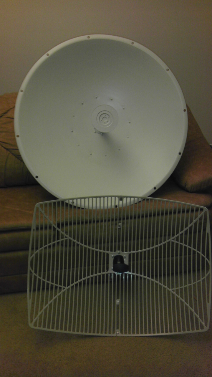 Hello, Did some more antenna measurements tonight. The Ubiquiti sectors were the new contenders for the "official sector" title. The 5G-16-120 <https://www.hamwan.org/t/tiki-index.php?page=Ubiquiti+5G-16-120&structure=HamWAN> didn't do so well. Gain is dreadful and the radiation pattern is nearly omnidirectional. Blah! The 5G-19-120 <https://www.hamwan.org/t/tiki-index.php?page=Ubiquiti+5G-19-120&structure=HamWAN> did a lot better. It looks to be a 90 degree sector though, if we're honest. -3dB points were measured just 81 degrees apart. The +/- 60 degree points look to be -8dB, not the -6dB I've come to expect from some manufacturer beamwidth claims. The radiation pattern is also a bit weird in its shape, but not awful. The frequency response is pretty good though. The final drawback of this sector is price. It's about $150 a piece. Although that is cheaper than the Laird sector which is $180 a piece. This Ubiquiti sector is also dual polarity, so if we ever do MIMO, antennas won't have to change. More contenders have arrived though! I'll get them tested soon. Hopefully they blow all these expensive sectors out of the water. :) Now, on the "official high gain antenna" front, I've measured two new contenders as well. The ARC-DA5834SD1 <https://www.hamwan.org/t/tiki-index.php?page=ARC+ARC-DA5834SD1&structure=HamWAN> does not disappoint. It is well constructed and weighs less than you'd think. The frequency response is the flattest of ANY of the antennas tested so far. The radiation pattern is THE most directional of any of the antennas tested so far as well. Just look at that gorgeous rejection, all at least -30dB down. This is the #1 choice if you've got the $300 (shipped) to spend on it. It is also a dual polarity antenna with a fair amount of isolation between the polarities. On the rear are N-connector to waveguide adapters. They combine to feed one solid circular waveguide that protrudes from the center of the dish. At the end of the waveguide structure the metal turns to plastic and the waves are allowed to radiate through the plastic shield/support onto the subreflector at the very tip. This subreflector has a really cool wavey pattern milled into it on the underneath to collimate all the waves properly to/from the main reflector dish. I found the N connectors somewhat hard to start threading for whatever reason. Was not getting alignment. The mounting system is well thought out and a pleasure to use, especially to adjust the tilt of the antenna! You just turn one nut to raise/lower the tilt. To rotate you can loosen both U-bolts. Now, normally this would make the antenna slide down. But they're thought of that and provide you with a stopper you install on the mast before hand. The weight of the antenna rotates on this base. When angled right, you just tighten the antenna's u-bolts. There's also a built-in mini-mast section to bolt a radio to. Very well thought out. A very nice antenna. But still, $300 shipped from Streakwave isn't cheap. WLANmall looks to have it <http://www.wlanmall.com/arc-34dbi-dual-pol-4-94-5875ghz-dp-dish.html> for much less shipping. Streakwave tried to jack the shipping on this antenna by another $50 *after* I placed the order. It would have been $350 if I let them have their way. The Poynting K-GRID-003-06 <https://www.hamwan.org/t/tiki-index.php?page=Poynting+K-GRID-003-06&structure=HamWAN>, henceforth known as "Die Antwoord <http://en.wikipedia.org/wiki/Die_Antwoord>", is a surprisingly well performing high gain antenna. It is designed and manufactured in South Africa <https://maps.google.com/maps?hl=en&ll=-26.10403,28.079563&spn=0.012689,0.009495&sll=-26.103982,28.079655&layer=c&cid=11252272406233210136&cbp=13,3.3,,0,2.79&panoid=inPysFz8CF29sKnrYx1ziw&gl=US&t=h&z=17&cbll=-26.104026,28.079467>, just like its musical namesake. It may indeed be "the answer" for HamWAN's directional antenna needs. While I do not have official trustworthy absolute gain comparison figures yet for any of the antennas, the preliminary numbers make it look like Die Antwoord gets about 5dB over its similar-in-size cousin, the Laird GD5W-28P <https://www.hamwan.org/t/tiki-index.php?page=Laird+GD5W-28P&structure=HamWAN>. It also looks like the $300 dish is only 1dB better. Die Antwoord also features a much flatter frequency response, and a far better radiation pattern than the Laird. You know you're doing something right when the manufacturer's published H-plane pattern <http://cdn.entelectonline.co.za/wm-43814-cmsimages/A-K-GD-003-06%20Datasheet.pdf> strongly resembles your own results. Notice the distinctive side-lobes touching -20dB on either side of the main lobe. Notice the containment of all other lobes within the -30dB limits. This is a FINE antenna! And for not lying about the patterns like so many others do, Poynting gets my "fine manufacturer" seal of approval. Poynting and I disagree on the frequency response, but the difference is 1dB, so I'll let it go. :) The gain is really quite flat. A surprising achievement for such a broadband antenna. In fact, the gain flatness is only bested by the $300 ARC dish mentioned in the previous paragraph. What does all this wonderful performance cost? Would you believe a mere $95 shipped <http://www.titanwirelessonline.com/Poynting-5-8GHz-31dBi-Grid-p/at-30gr-58.htm>? NOTE: Do *NOT* follow the advice of the one gentleman who commented on this product at the link I just gave you. The man is a fool who ruined his antenna. :) The radiating element is meant to be unconventionally oriented. Follow the assembly instructions. The physical size difference between the $95 Die Antwoord (bottom) and the $300 ARC dish (top) is small. Here they are both enjoying my couch, just yearning to RF @ each other: To truly measure the real long distance gain of these antennas, I've got to test them over a longer range. Something like 100m should be enough to make the EM waves mostly perpendicular to the DUT antennas instead of hitting them at weird angles. 