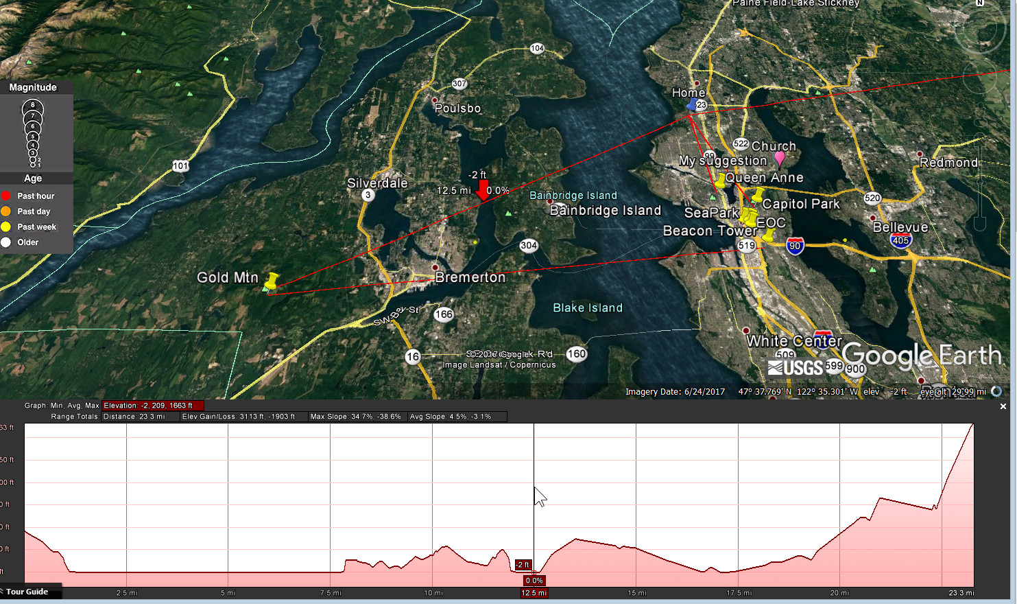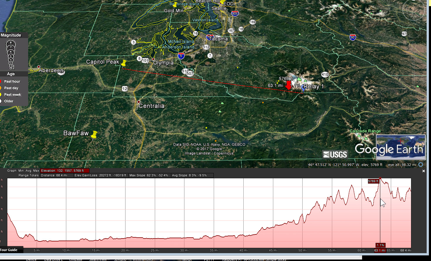 Here is one approach to see if you have even a little chance of connecting. Use Google Earth. First plot the location of Capitol Peak. The coordinates are 46.9730333, -123.1382166. Second, plot the coordinates of your location. Put a placemark at both locations. Now using the ruler tool draw a straight line between the two locations and save it. Then right click on that line and select elevation profile to see if you have line of sight. See attached screen captures (don't know if attachments will go through, I'll try). In the third attachment, you see the elevation profile for the path I was considering. It won't work because there is a much higher peak in between Capitol Peak and the location I was interested in (Inspiration Point on the side of Mount Rainer). The arrow shows where that peak is along the path, and the elevation profile shows that isn't the only obstruction, there are a few other peaks also in the way. Another elevation profile attached is from my house in NW Seattle to Gold Mtn. On that you can see that there is clearly a good path, no obstructions along the way. I just have to find a location on my lot that doesn't have trees blocking the view (which is its own challenge). Carl, N7KUW -----Original Message----- From: PSDR [mailto:psdr-bounces@hamwan.org] On Behalf Of Lee Chambers Sent: Sunday, August 27, 2017 10:23 AM To: Puget Sound Data Ring Subject: Re: [HamWAN PSDR] Node question Thanks. I'm pretty low, but just maybe there's a shot between the distant hills. What should I look for? Lee