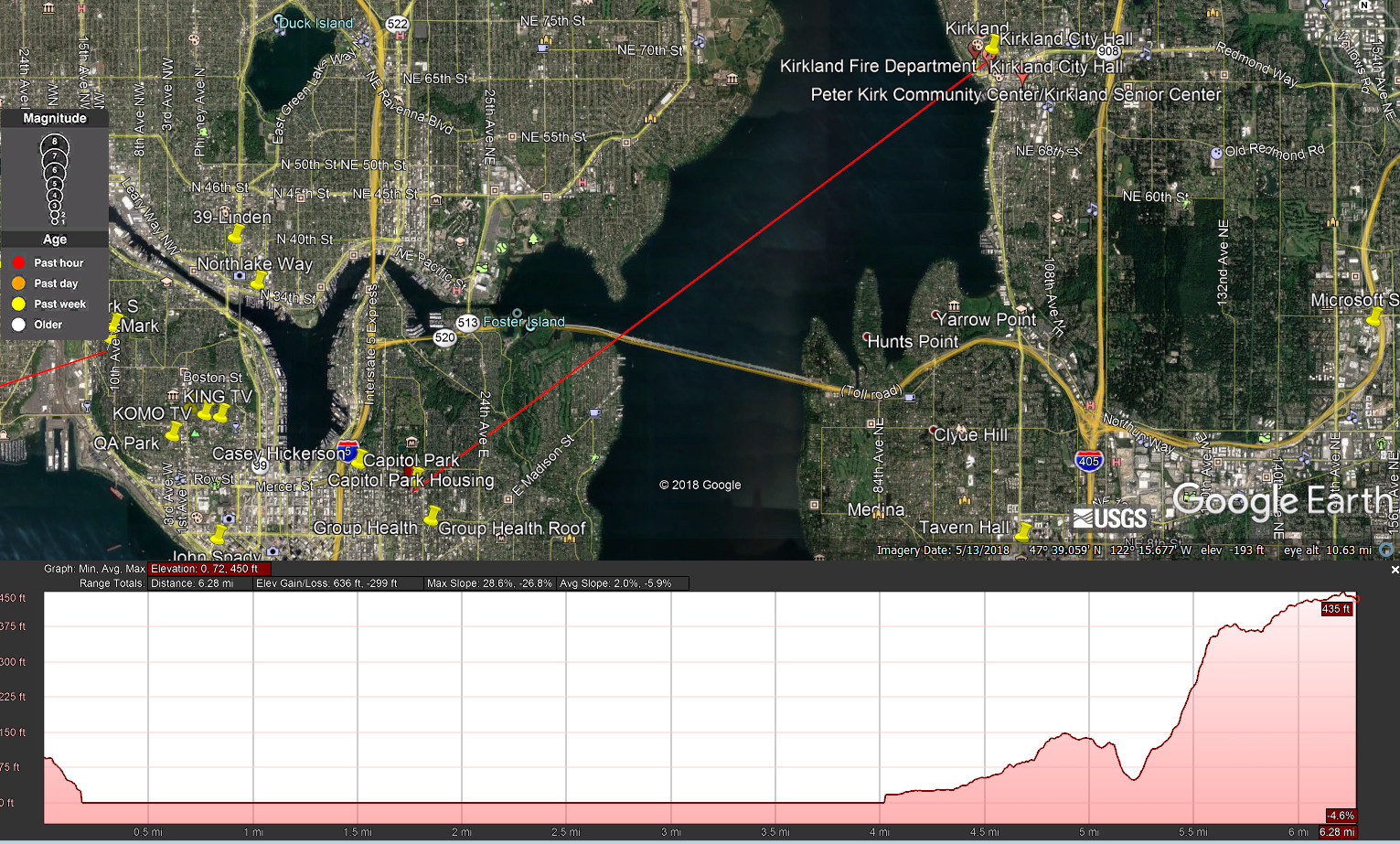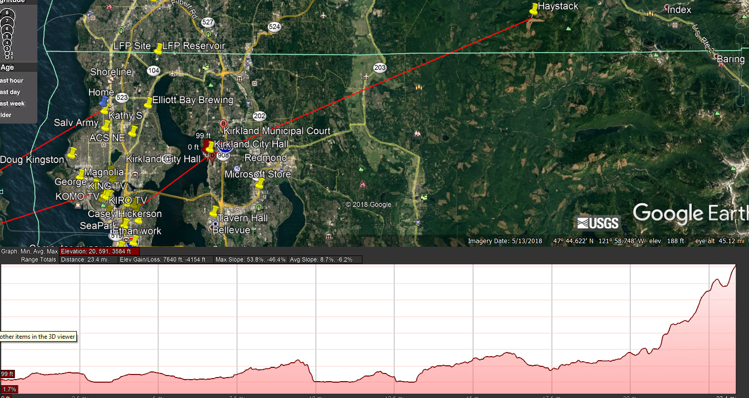 You will need true line of sight (visual, clear path) to one of the HamWAN sector locations. For a second dish, you’ll need the same to a second sector. Google Earth can give you a good start in determining if you have line of sight, followed by visit to your rooftop with binoculars. Lastly, once you feel confident you have a shot, invite someone with a dish or panel to visit with you and do a test shot. Is your City Hall at 123 5 th Ave, Kirkland? It looks like a two story building at that address? If so, it looks like you should be able to shoot to Capitol Park (in Seattle) and to Haystack. See attached.