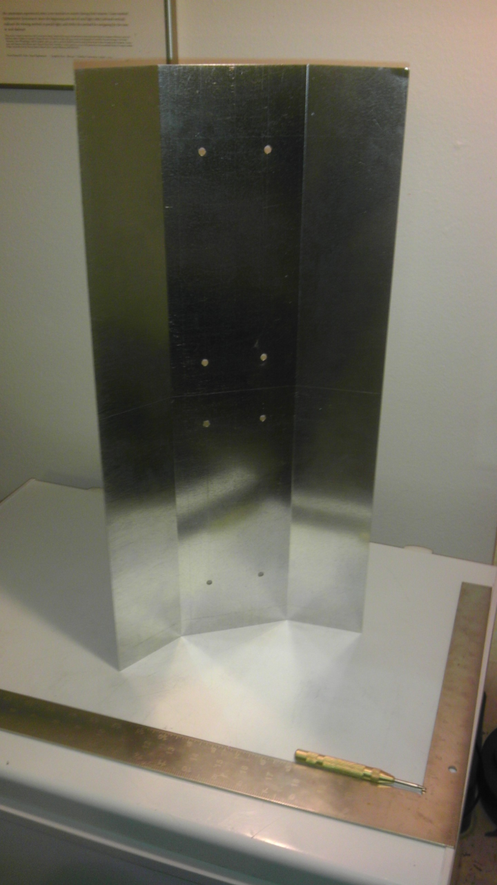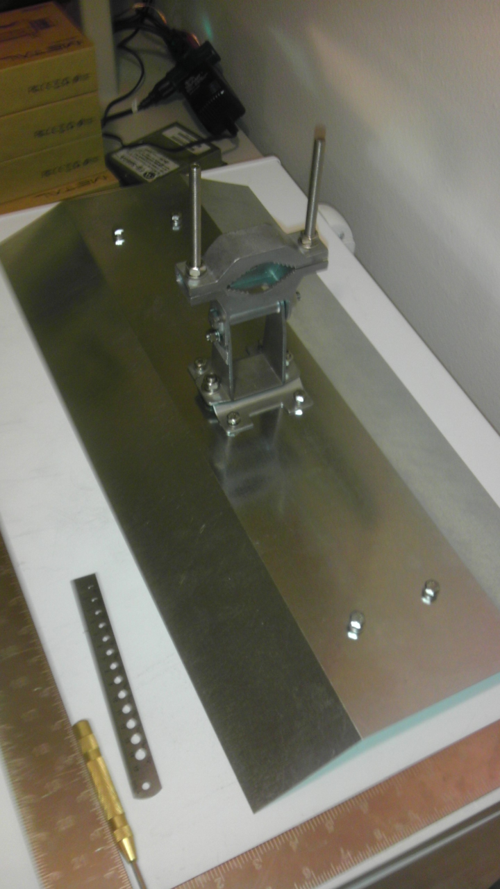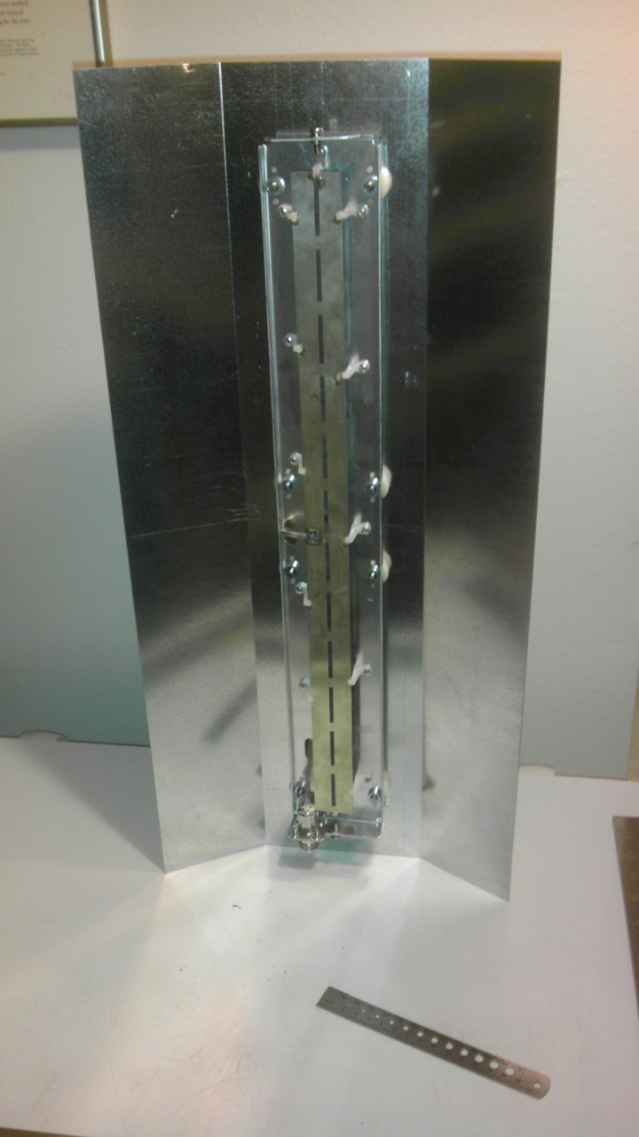 And despite all that, the attenuation between TX+RX antennas is still 65.5dB! This must be reflections internal to my garage. Gotta re-run these measurements outside. Also, the angles on the shield are too shallow. I gave it a 130 deg opening, but the back is recessed from the active elements of the antenna, so this doesn't actually shield as much as it should. It'll be fun to see this on the radiation pattern measurement range! See before + after. Might have to use a wider shield. This is 2ft by 1ft sheet. The bolt pattern won't work for production use. In real life, if these shields are to be used, they'll just hang on via the 2 mounting bolts at the very center of the back of the antenna. You can just see their nuts pointing up in the last picture. Undoing all the other bolts while the antenna is inside the radome would permanently break the antenna. Spacers would get knocked loose, and you'd have to destroy the radome to re-align things. This antenna is entirely metric. Horizontal spacing between all bolts = 6cm. Spacing between the upper/lower bolts and the inner bolts = 20cm. Spacing between the inner bolts = 6.8cm. Holes are fine with 1/4" drill. Bolts are M10. --Bart