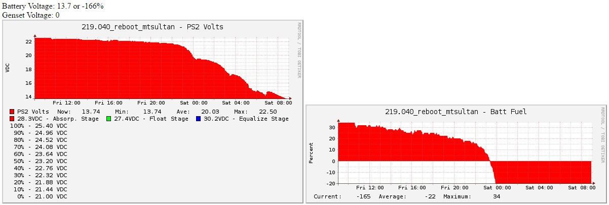 Looks like there was some power mis-wiring on the last emergency visit up there. That one was to fix a low oil condition in the generator that prevented it from supplying emergency charge to the batteries when needed, and to provide the DMR repeater with power toggle capability since its Ethernet locked up once. During the DMR power toggle wiring, a critical charger was mis-wired and was no longer able to charge the bank.