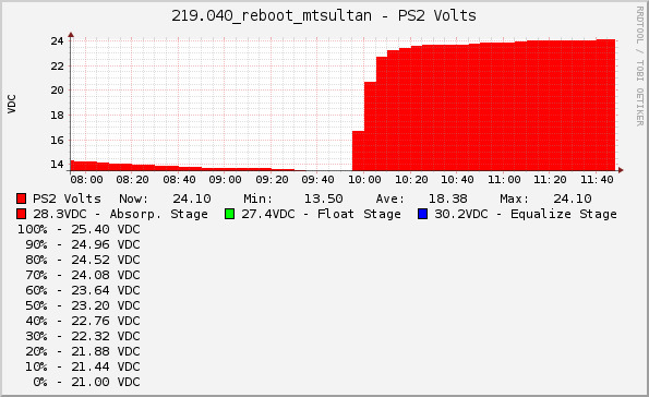 If those are my batteries, I will replace them for free. Just need the cores. Let me know good sirs. Safe journey to the top. Thanks, Paul On Sat, Feb 11, 2017 at 9:18 AM -0800, "Bart Kus" <me@bartk.us<mailto:me@bartk.us>> wrote: Something has gone seriously wrong @ Haystack. We're down to 14V on the 24V battery bank: [cid:part1.4F99FFE2.91623FE5@bartk.us] Ryan's already 1/2 way up on foot, and I'm leaving now to follow him on snowmobile. Site will probably die in the next couple hours, before we even get there. Boourns. --Bart On 2/9/2017 4:31 PM, Nigel Vander Houwen wrote: Aaaaand apparently Haystack-S3 wanted to prove me wrong. It seems to be back for the moment, so the issue appears to have been temporary, at least for now. We’ll keep an eye out for further issues. Nigel On Feb 9, 2017, at 14:06, Nigel Vander Houwen <nigel@nigelvh.com><mailto:nigel@nigelvh.com> wrote: Hey All, Got a couple of quick updates for you this afternoon. First, our PTZ camera on Baldi we added in the fall and died in a power failure shortly thereafter seems to have made a miraculous recovery in another power failure/recovery two days ago. So, for now the camera is online, but it hasn’t left us with high confidence. At this point we’re planning to acquire and install a replacement power supply, as we think the coincidence with the camera dying and recovering both in mains power events is pretty telling. Baldi in general has had a rough season this winter with regards to power, and while we do have a UPS up there, the batteries aren’t holding out long enough. We’re working out when we can get the additional capacity up there. For now we’re relying on our UPS, and the onsite generator (not automatic, and not in our control). We have also apparently just lost Haystack sector 3. The rest of Haystack remains online, but if you connect to, or hoping to connect to S3, that’s not going to work for the moment. There appears to be a short circuit, and the modem is powered down. We’ve tried resetting the PoE injector, and the short remains, so until we can get up there to diagnose, hopes aren’t high for S3 coming back online. Thanks! Nigel _______________________________________________ PSDR mailing list PSDR@hamwan.org<mailto:PSDR@hamwan.org> http://mail.hamwan.net/mailman/listinfo/psdr _______________________________________________ PSDR mailing list PSDR@hamwan.org<mailto:PSDR@hamwan.org> http://mail.hamwan.net/mailman/listinfo/psdr Something has gone seriously wrong @ Haystack. We're down to 14V on the 24V battery bank: [cid:part1.4F99FFE2.91623FE5@bartk.us] Ryan's already 1/2 way up on foot, and I'm leaving now to follow him on snowmobile. Site will probably die in the next couple hours, before we even get there. Boourns. --Bart On 2/9/2017 4:31 PM, Nigel Vander Houwen wrote: Aaaaand apparently Haystack-S3 wanted to prove me wrong. It seems to be back for the moment, so the issue appears to have been temporary, at least for now. We’ll keep an eye out for further issues. Nigel On Feb 9, 2017, at 14:06, Nigel Vander Houwen <nigel@nigelvh.com><mailto:nigel@nigelvh.com> wrote: Hey All, Got a couple of quick updates for you this afternoon. First, our PTZ camera on Baldi we added in the fall and died in a power failure shortly thereafter seems to have made a miraculous recovery in another power failure/recovery two days ago. So, for now the camera is online, but it hasn’t left us with high confidence. At this point we’re planning to acquire and install a replacement power supply, as we think the coincidence with the camera dying and recovering both in mains power events is pretty telling. Baldi in general has had a rough season this winter with regards to power, and while we do have a UPS up there, the batteries aren’t holding out long enough. We’re working out when we can get the additional capacity up there. For now we’re relying on our UPS, and the onsite generator (not automatic, and not in our control). We have also apparently just lost Haystack sector 3. The rest of Haystack remains online, but if you connect to, or hoping to connect to S3, that’s not going to work for the moment. There appears to be a short circuit, and the modem is powered down. We’ve tried resetting the PoE injector, and the short remains, so until we can get up there to diagnose, hopes aren’t high for S3 coming back online. Thanks! Nigel _______________________________________________ PSDR mailing list PSDR@hamwan.org<mailto:PSDR@hamwan.org> http://mail.hamwan.net/mailman/listinfo/psdr _______________________________________________ PSDR mailing list PSDR@hamwan.org<mailto:PSDR@hamwan.org> http://mail.hamwan.net/mailman/listinfo/psdr
