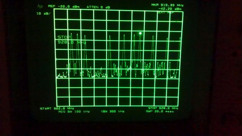 Some of you may know I did a survey of 900MHz recently, along with the real-world modem tests. The spectrum analyzer inside the modem showed a very dire picture of the band, with the noise floor averaging about -60dBm. Today, in preparation for 1.2GHz antenna installs, I ran some coax to the roof and was able to see the 900MHz vertical there directly on a proper spectrum analyzer. The spectrum story is quite different! Here's a view of a typical spectrum from 902-928MHz: floor The reference line at the top is -20dBm and each vertical graticule is 10dB. The noise floor looks to be about 7 graticules below -20dBm, or -90dBm. There is about 2dB loss in the 45ft feedline, so let's call the floor -88dBm. There are however some sparse transmissions in this band. I wish I could find a way to measure their duty cycle or plot their average power. Sadly the best I can do is to record their maximum power using the peak-hold mode of the spectrum analyzer. I captured about a 10 minute sample of air time, and here are the results: peaks The bright dot is the peak marker, and it reads -42dBm, which is really -40dBm at the antenna after you account for the coax loss. The peaks are all suspiciously uniform in power, so this may be a single transmitter just jumping around the spectrum with each burst. I can't explain why the Mikrotik 9HPn reports such a vastly different spectrum. It may be mixing the 860-900MHz cell band into the 900MHz band? I need to perform some further tests to figure this out. There are definitely strong signals in the 860-900MHz range (not shown in these photos). --Bart